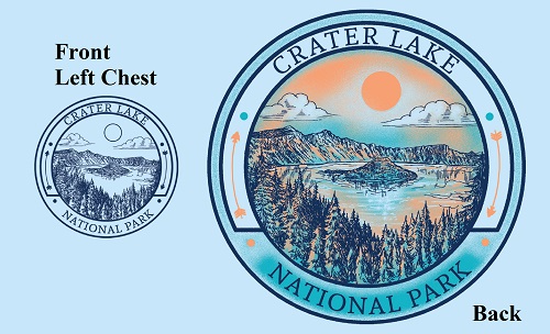 An adult size long sleeve shirt with an ornate design of Crater Lake on the front left chest and shirt back in an arctic blue color.