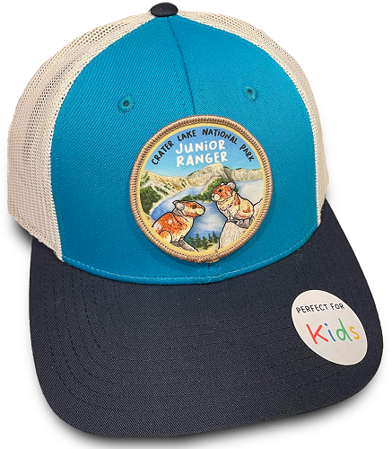 Crater Lake National Park junior ranger trucker hat, featuring two adorable pika.