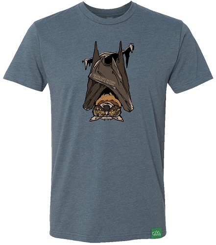 A soft poly blend crewneck t-shirt featuring a bat with a cave's reflection in their sunglasses.